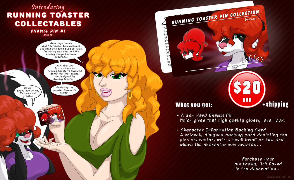 A hard enamel pin featuring the original skunkette character created by Running Toaster via an InspireMe session, Ashley